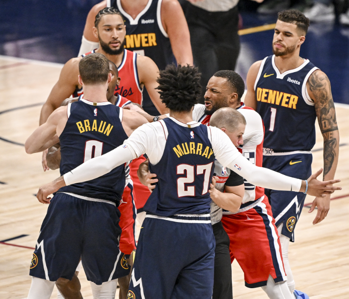 鲍威尔推倒穆雷的瞬间,丹佛高原的空气突然变得粘稠。穆雷球衣后背在地板上擦出的静电火花,照亮了布劳恩脖子上暴起的青筋。裁判掏技术犯规的动作像是慢镜头回放,而场边布鲁斯-布朗无意识摩挲冠军戒指的样子,让冲突的硝烟里突然飘起一缕2019年猛龙更衣室的香槟气息。